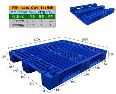 產(chǎn)品型號(hào) HD-1210CW5 產(chǎn)品名稱 T55 產(chǎn)品外尺寸(mm) 1200*1000*150 產(chǎn)品結(jié)構(gòu) 單面網(wǎng)格川字型(可內(nèi)置鋼管) 承載量 動(dòng)載1.5噸,靜載4噸,貨架1噸 產(chǎn)品認(rèn)可標(biāo)準(zhǔn) ISO9001:2000質(zhì)量體系認(rèn)證 此款塑料托盤上表面可內(nèi)置4根鋼管,川字底部?jī)?nèi)置4根鋼管,貨架上的載重量大,適合平地墊倉(cāng),在貨架上和