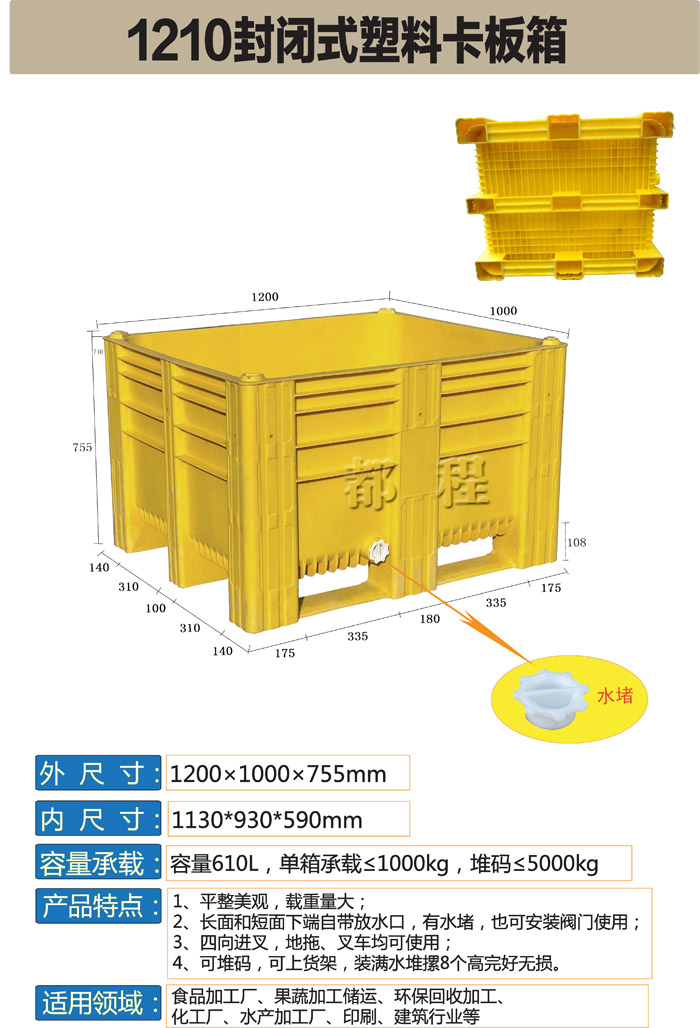 編 號(hào): 3#卡板箱 外尺寸(mm): 1200×1000×755 內(nèi)尺寸(mm): 1130*930*590 備 注: 適合食品加工、果蔬加工儲(chǔ)運(yùn)、環(huán)?;厥占庸?、化工、水產(chǎn)加工、印刷、建筑等行業(yè)
